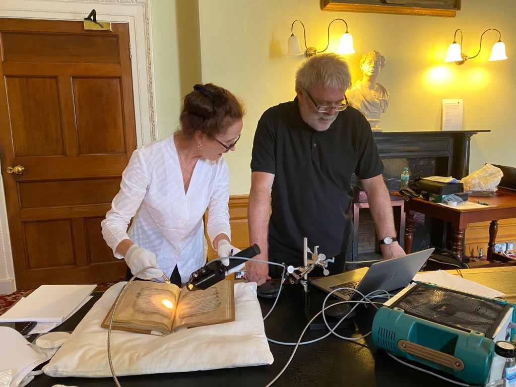 Dr Fenella France & Prof. Ó Macháin carrying out FORS analysis of the Cathach at the RIA Library